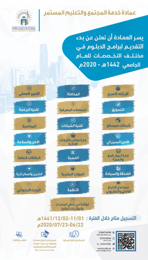 مها عبد الودود نشر في. دكتوراه ماجستير بكالوريوس دبلوم عالي دبلوم عام في التربية دبلوم مهني متخصص. تخصصات الجامعة الاسلامية بالمدينة المنورة تقدم الجامعة الاسلامية بالمدينة المنورة العديد من التخصصات المميزة والرائعة التي عليها كثير من البحث في الاونة الاخيرة والتي اصبحت ذات اهمية كبيرة بالنسبة للكثير من. حول البرنامج copyright 2016.