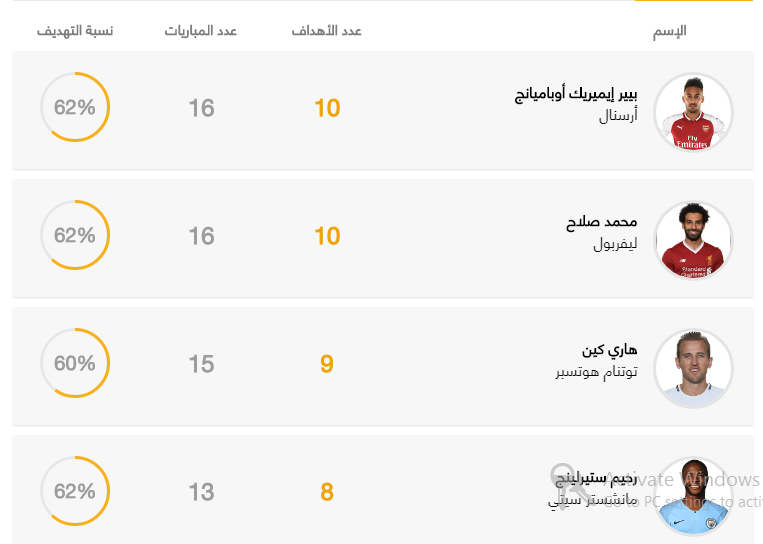 ترتيب هدافي الدوري الانجليزي 2018 2019 صلاح وأوباميانج وماني